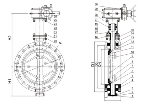 1、本閥采用三偏心密封結(jié)構(gòu),閥座與蝶板幾乎無磨損,具有越觀越緊的密封功能。