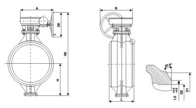 全焊接雙向壓硬密封蝶閥主要由閥體、彈簧、閥座壓板、閥座、密封圈、壓板、蝶板及閥桿等主要零部件組成。閥座與閥桿中心線有一個(gè)偏心a,閥體中心與閥桿中心有一個(gè)偏心b,密封面與閥體中心線有一個(gè)角度β。閥座用閥座壓板壓住,在閥體內(nèi)可以游動(dòng)。壓力從正面進(jìn)入時(shí),在介質(zhì)壓力的作用下,閥座與閥體之間有一個(gè)間隙c,蝶板向前變形,使閥門(mén)密封。反向打壓時(shí),閥座在介質(zhì)壓力的作用下,向前走,同時(shí)蝶板也向后變形,這樣閥座的移動(dòng)正好補(bǔ)償了蝶板的變形,使閥門(mén)密封。